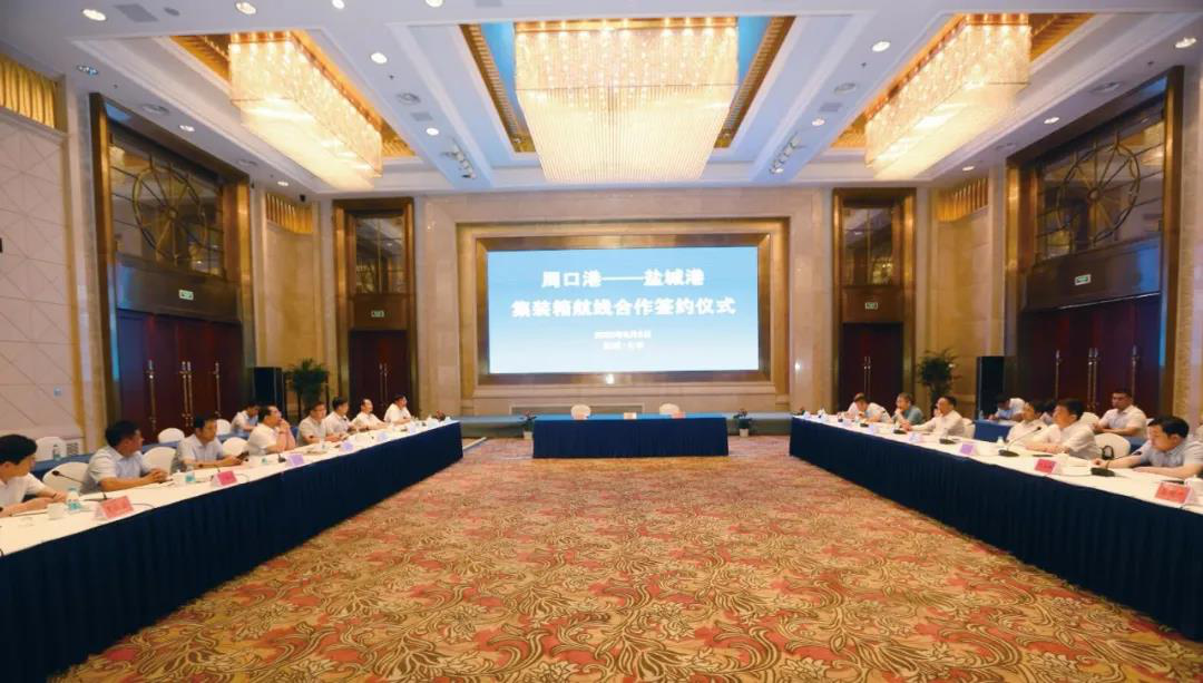 8月5日上午,鹽城港—周口港集裝箱航線合作簽約儀式在鹽城港大豐港區舉行,周口市市長丁福浩、副市長胡軍,鹽城市副市長吳本輝,鹽城市大豐區委書記薛盛堂,江蘇鹽城港控股集團董事長周正雄等出席儀式。