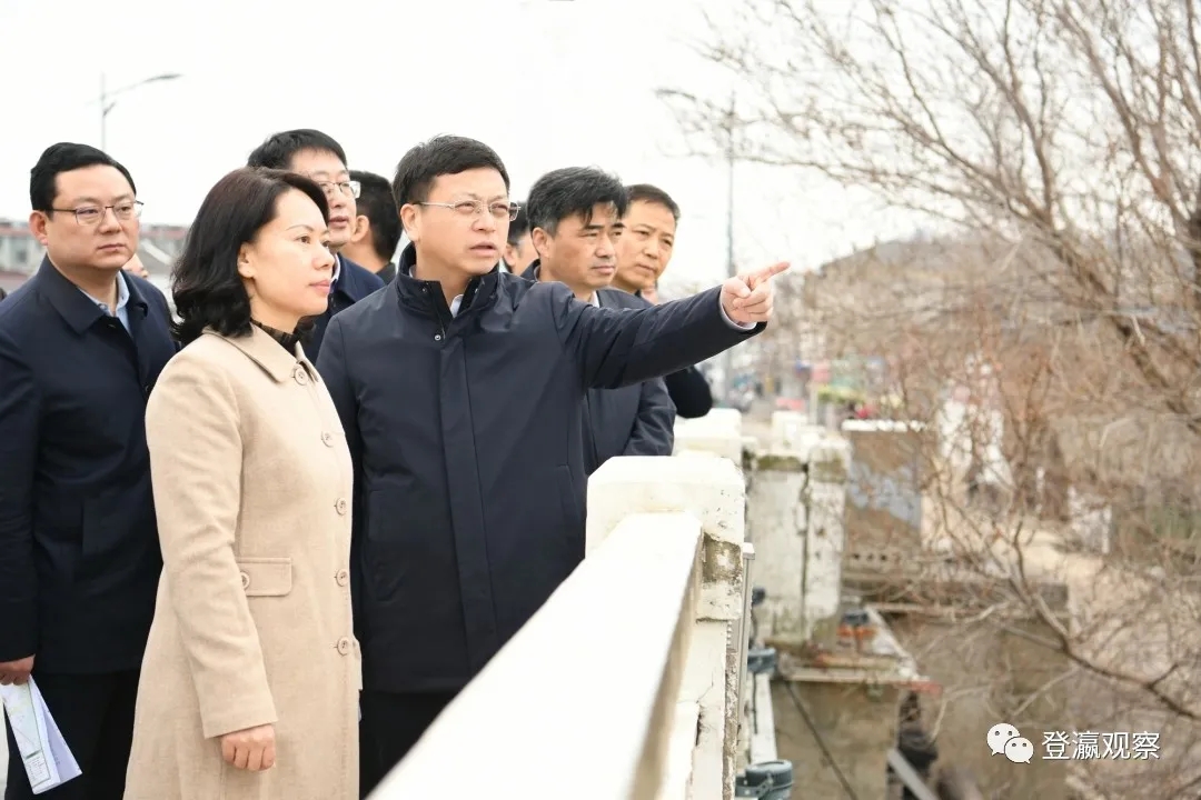 ▲市長(zhǎng)曹路寶察看鹽都區(qū)龍岡鎮(zhèn)鳳凰橋航段現(xiàn)場(chǎng)
