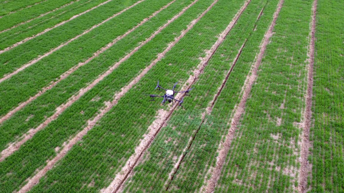 在田間的一頭,華豐公司的植保無人機“飛手”正在進行“飛防”作業,確保了農田生產安全,相比傳統人工打藥防治,每畝地的勞動力、藥品成本可降低45%。