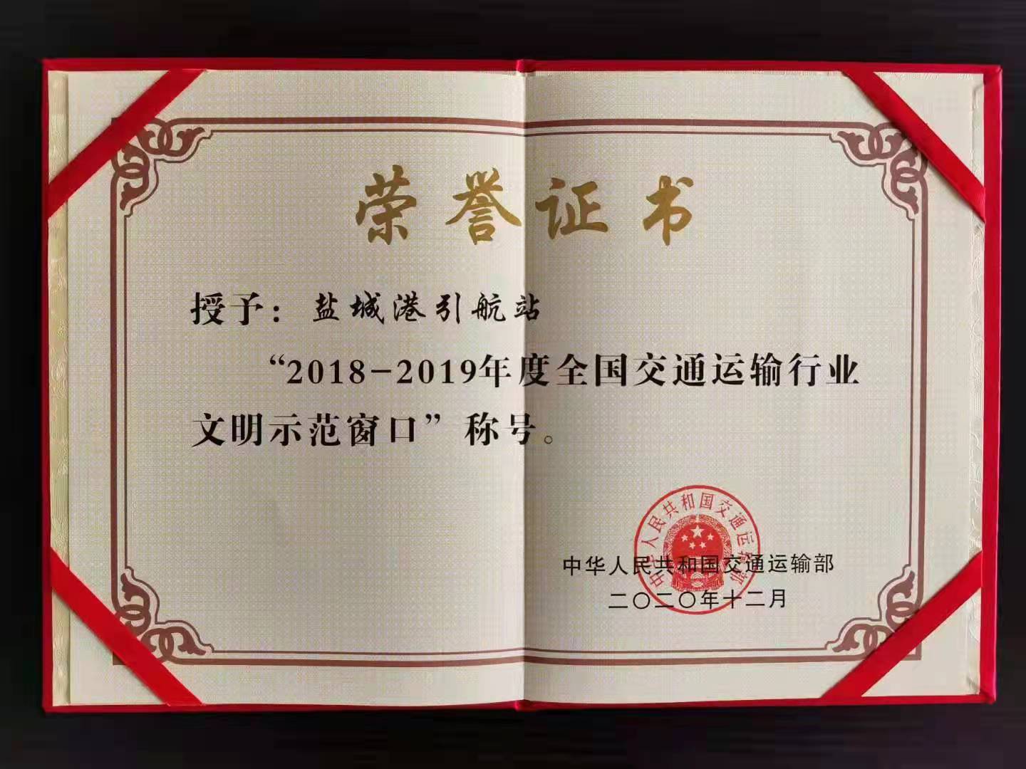 2020年12月,鹽城港引航站獲得“全國交通運輸行業(yè)文明示范窗口”榮譽。