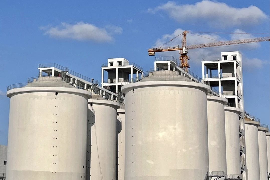 據介紹,淺圓倉單體是項目建設的關鍵點,也是重難點,建成后項目周轉貨物可達80萬噸,是濱海港區規模最大的儲備糧庫項目。施工過程中,項目團隊采用了淺圓倉滑模施工工藝,在圓周均勻布置46個油壓千斤頂,推動模板系統整體緩慢滑升,全時段開展邊滑升邊進行倉壁的鋼筋綁扎和混凝土澆筑作業,在持續作業中實現倉壁一次成型。