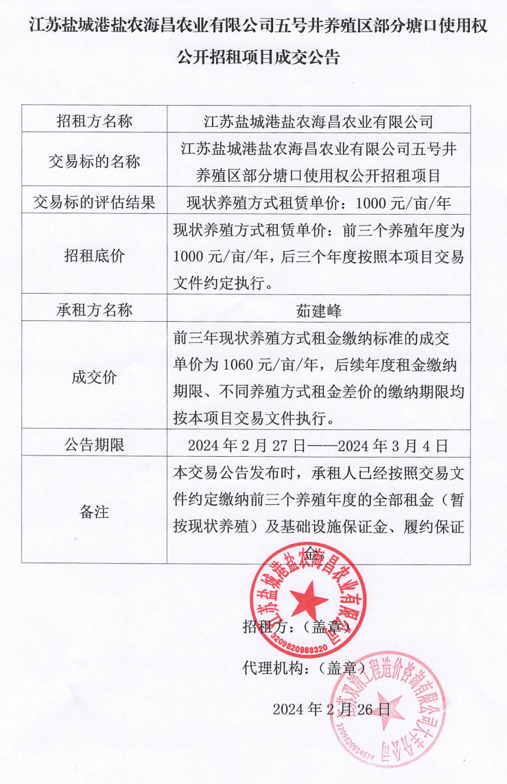 江蘇鹽城港鹽農海昌農業有限公司五號井養殖區部分塘口使用權公開招租項目成交公告