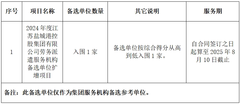 2024年度江蘇鹽城港控股集團(tuán)有限公司勞務(wù)派遣服務(wù)機(jī)構(gòu)備選單位擴(kuò)增項目,包含江蘇鹽城港控股集團(tuán)有限公司及其子(控)公司的勞務(wù)派遣服務(wù)。主要服務(wù)包括:勞務(wù)派遣、崗位外包、人員招聘、績效考核、檔案整理、日常培訓(xùn)、物業(yè)等服務(wù)項目。勞務(wù)派遣人員主要包括但不限于:物業(yè)管理項目負(fù)責(zé)人、保安、門衛(wèi)、衛(wèi)生保潔、會務(wù)、前臺、酒店服務(wù)員、汽車駕駛員、部分碼頭一線操作工、生產(chǎn)線操作工、顧問等。具體根據(jù)項目情況決定。