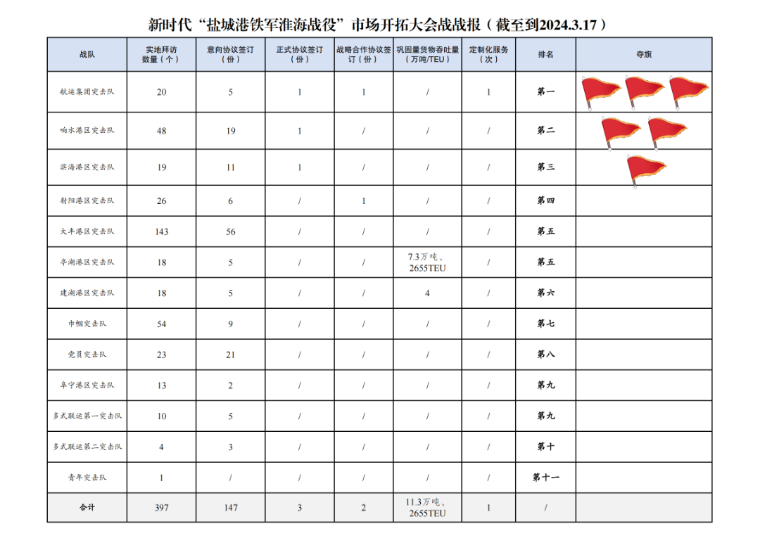 1.累計拜訪客戶數量397家:其中大豐港區突擊隊143家,巾幗突擊隊54家,響水港區突擊隊48家,射陽港區突擊隊26家,黨員突擊隊23家,航運集團突擊隊20家,濱海港區突擊隊19家,亭湖港區突擊隊18家,建湖港區突擊隊18家,阜寧港區突擊隊13家,多式聯運第一突擊隊10家,多式聯運第二突擊隊4家,青年突擊隊1家。