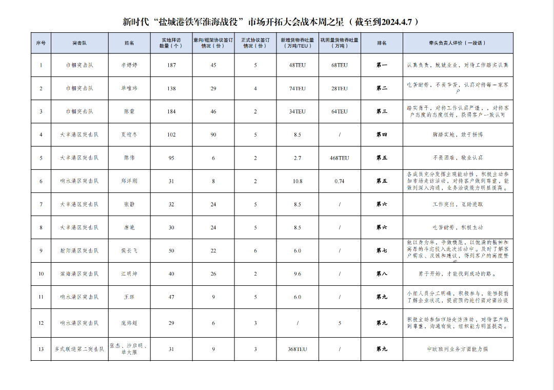 3.簽訂正式協議數量56份:其中響水港區突擊隊10份,巾幗突擊隊9份,大豐港區突擊隊7份,射陽港區突擊隊6份,多式聯運第二突擊隊6份,黨員突擊隊5份,航運集團突擊隊5份,濱海港區突擊隊4份,建湖港區突擊隊1份,阜寧港區突擊隊1份,多式聯運第一突擊隊1份,青年突擊隊1份。