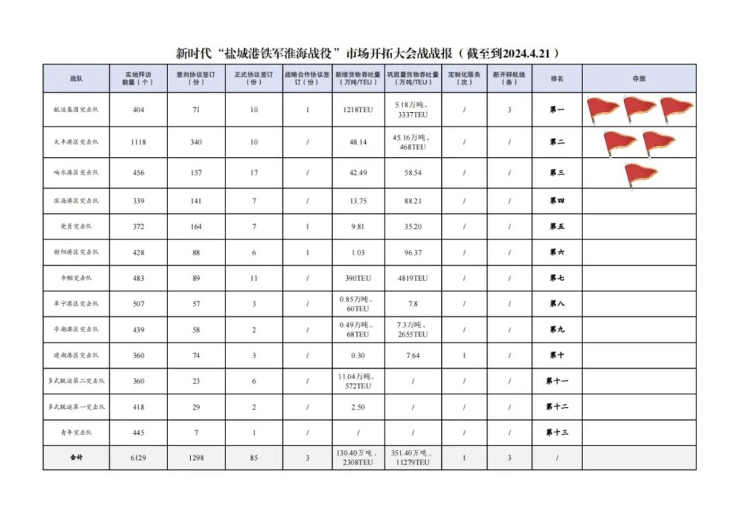 2.簽訂意向協議數量1298份:其中大豐港區突擊隊340份,黨員突擊隊164份,響水港區突擊隊157份,濱海港區突擊隊141份,巾幗突擊隊89份,射陽港區突擊隊88份,建湖港區突擊隊74份,航運集團突擊隊71份,阜寧港區突擊隊57份,亭湖港區突擊隊52份,多式聯運第一突擊隊29份,多式聯運第二突擊隊23份,青年突擊隊7份。