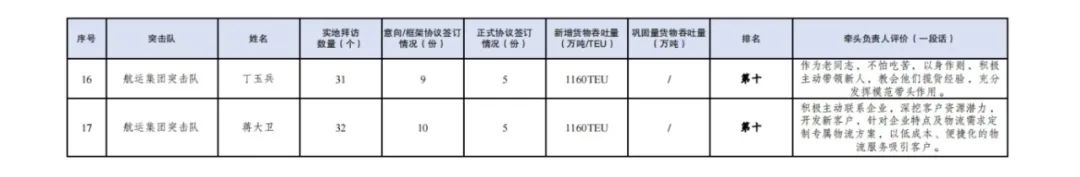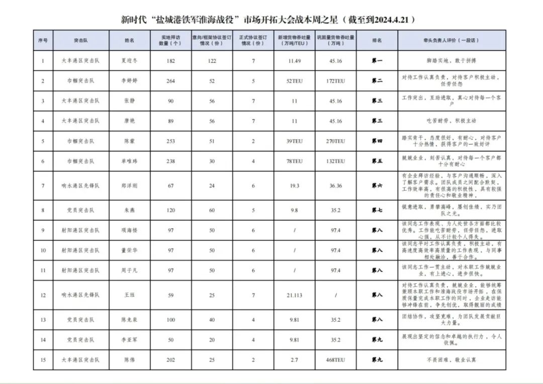 第一名:大豐港區突擊隊 夏迎冬(拜訪客戶182家,簽訂意向協議122份,簽訂正式協議7份,新增貨物吞吐量11.49萬噸,鞏固量貨物吞吐量45.16萬噸)