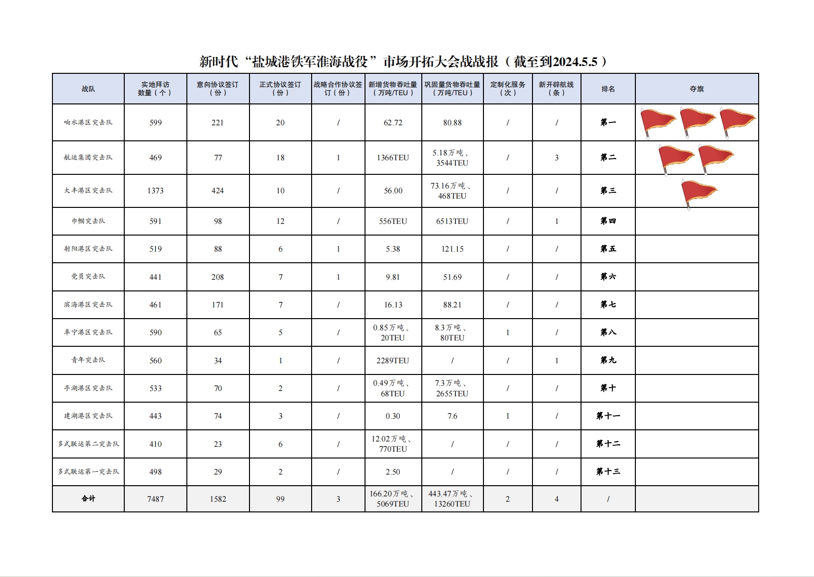 6.新增貨物吞吐量166.20萬(wàn)噸、5069TEU:其中響水港區(qū)突擊隊(duì)62.72萬(wàn)噸,青年突擊隊(duì)2289TEU,大豐港區(qū)突擊隊(duì)56萬(wàn)噸,航運(yùn)集團(tuán)突擊隊(duì)1366TEU,濱海港區(qū)突擊隊(duì)16.13萬(wàn)噸,多式聯(lián)運(yùn)第二突擊隊(duì)12.02萬(wàn)噸、770TEU,黨員突擊隊(duì)9.81萬(wàn)噸,巾幗突擊隊(duì)556TEU,射陽(yáng)港區(qū)突擊隊(duì)5.38萬(wàn)噸,亭湖港區(qū)突擊隊(duì)0.49萬(wàn)噸、68TEU,多式聯(lián)運(yùn)第一突擊隊(duì)2.5萬(wàn)噸,阜寧港區(qū)突擊隊(duì)0.85萬(wàn)噸、20TEU,建湖港區(qū)突擊隊(duì)0.3萬(wàn)噸。