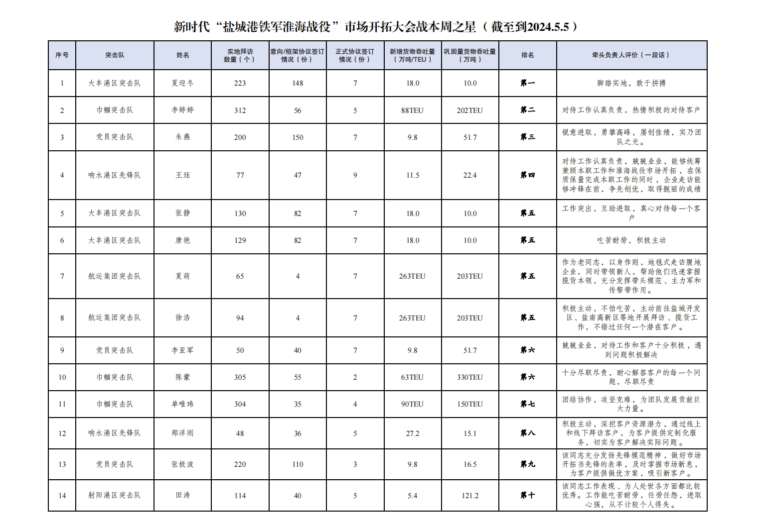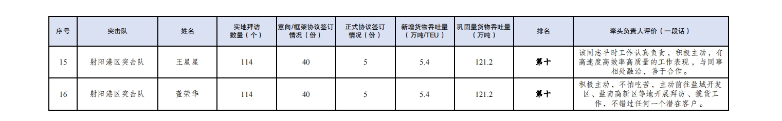 第一名:大豐港區(qū)突擊隊(duì) 夏迎冬(拜訪客戶(hù)223家,簽訂意向協(xié)議148份,簽訂正式協(xié)議7份,新增貨物吞吐量18萬(wàn)噸,鞏固量貨物吞吐量10萬(wàn)噸);