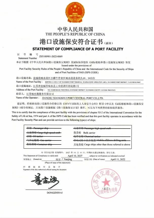 近日,在省、市相關(guān)部門、專家和咨詢單位的大力支持幫助下,響水港區(qū)、射陽港區(qū)10個萬噸級以上泊位順利獲得江蘇省交通運(yùn)輸廳核發(fā)的港口設(shè)施保安符合證書,為響水港區(qū)、射陽港區(qū)一類開放口岸國家級驗(yàn)收奠定了堅(jiān)實(shí)基礎(chǔ)。