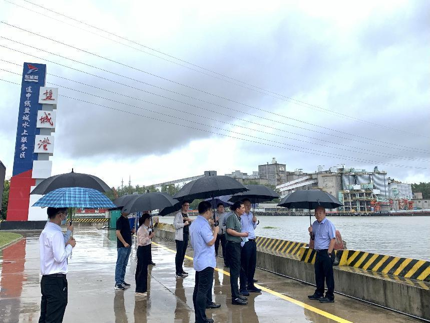 在新洋港水上服務區,陳正華和水上服務區負責人分別匯報了鹽城港水上服務區為內河船民停靠服務的5類23項服務功能,以及目前全市首家水上加油加氣站的建設進度情況。