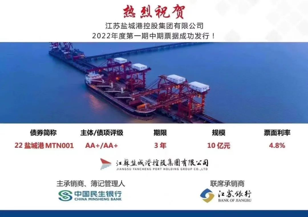 9月21日,鹽城港集團2022年度第一期中期票據(jù)成功發(fā)行,金額10億元,票面利率4.8%,進一步提振了資本市場對鹽城港集團發(fā)展的信心。