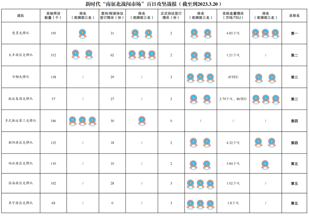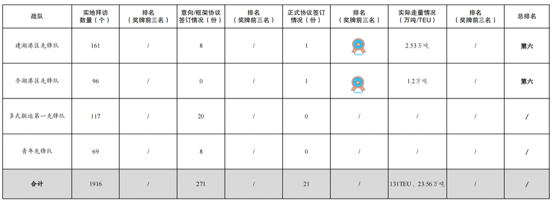 4.實際走量131TEU、23.56萬噸:其中黨員先鋒隊4.85萬噸,射陽港區(qū)先鋒隊4.32萬噸,響水港區(qū)先鋒隊3.84萬噸,航運集團先鋒隊2.79萬噸、86TEU,建湖港區(qū)先鋒隊2.53萬噸,阜寧港區(qū)先鋒隊1.8萬噸,大豐港區(qū)先鋒隊1.21萬噸,亭湖港區(qū)先鋒隊1.2萬噸,濱海港區(qū)先鋒隊1.02萬噸,巾幗先鋒隊45TEU。