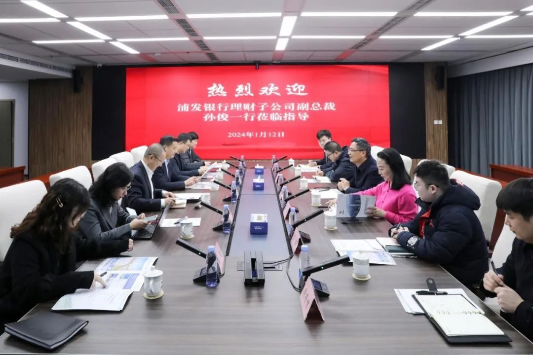 1月12日,浦發銀行理財子公司副總裁孫俊率隊拜訪我集團,雙方就進一步開展全面深入的金融合作,推動實現更高質量發展進行交流討論,集團黨委副書記、董事、總經理陸帥接待孫俊一行。浦發銀行鹽城分行黨委書記、行長李明,集團副總經理袁欣,集團投融資部相關負責同志等參加。