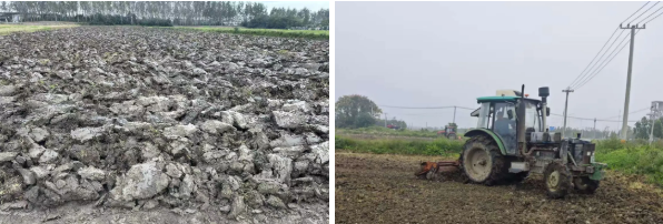為預防連續陰雨天氣給秋播耕整帶來的“爛耕”“爛種”風險,水稻收割一結束,技術人員便迅速深入田間,逐塊排查墑情。對于土壤濕度大、易積水的地塊,立即開挖排水溝,加速積水排出,降低土壤含水量,為耕整作業掃清障礙。在耕整過程中,公司嚴格執行秸稈還田率達到100%標準,將農業廢棄物變廢為寶,既改善土壤結構,又增加有機質含量;旋耕整地嚴格把控質量,土壤深翻深度控制在25—30厘米,確保耕作層疏松透氣,有利于小麥根系下扎;農機操作要求“耕翻到頭、到邊,無漏耕、無死角”,確保地塊耕整質量均勻一致,為高質量播種打造“優質土壤環境”。