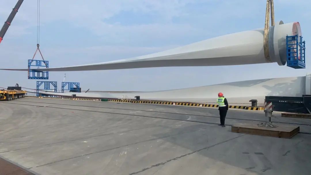 2.10月18日,風電大件攻堅專班成功吊裝102M葉片,這次葉片的成功裝卸既是射陽港區在10MW風電發電機組及102M葉片吊裝領域零的突破,也為未來深遠海超大件吊裝提供了技術保障。
