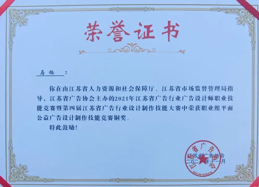 此次大賽是第四屆江蘇省百萬(wàn)技能人才技能競(jìng)賽崗位練兵活動(dòng)其中一項(xiàng)重要賽事,由江蘇省人力資源和社會(huì)保障局、江蘇省市場(chǎng)監(jiān)督管理局、江蘇省廣告協(xié)會(huì)聯(lián)合舉辦,以“永遠(yuǎn)跟黨走”競(jìng)賽主題,內(nèi)容包含廣告專業(yè)理論知識(shí)考試和技能實(shí)操競(jìng)賽,來自全省各市區(qū)130多支代表隊(duì)參加角逐。其中,文化傳媒公司5名參賽選手在理論知識(shí)考試和技能實(shí)操競(jìng)賽成績(jī)中取得優(yōu)異成績(jī),均獲得三級(jí)廣告設(shè)計(jì)師職業(yè)技能等級(jí)證書。
