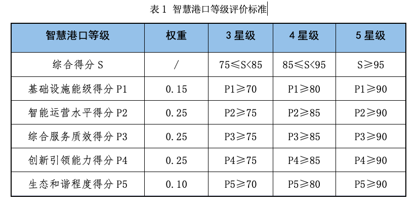 具體實施等級評價中,還須遵循四個原則:一是基于評價指標體系的綜合得分,應為港口智慧等級評價的主要依據;二是為充分反應智慧港口“智于科技、慧于生態”的內涵實質,每個指標都有相應評價尺度和標準,且計算權重不同;三是港口智慧等級評價綜合得分是各指標下所有內容的加權得分之和,滿分為100分;四是等級評價標準中設定的單項得分最低標準,也應作為港口智慧等級評價的重要依據。