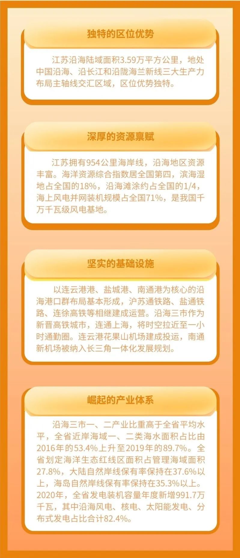 江蘇“十四五”規(guī)劃綱要明確,沿海地區(qū)深化港產(chǎn)城融合發(fā)展,著力提升海洋經(jīng)濟、生態(tài)經(jīng)濟和樞紐經(jīng)濟,打造令人向往的生態(tài)風(fēng)光帶、人海和諧的藍色經(jīng)濟帶,成為新的增長極。江蘇省第十四次黨代會提出,全力推進沿海地區(qū)高質(zhì)量發(fā)展,加快陸海統(tǒng)籌發(fā)展,大力發(fā)展海洋經(jīng)濟,著力塑造“繽紛百里”“生態(tài)百里”“藍灣百里”濱海特色風(fēng)貌,努力把沿海地區(qū)打造成綠色生態(tài)高質(zhì)量發(fā)展經(jīng)濟帶。