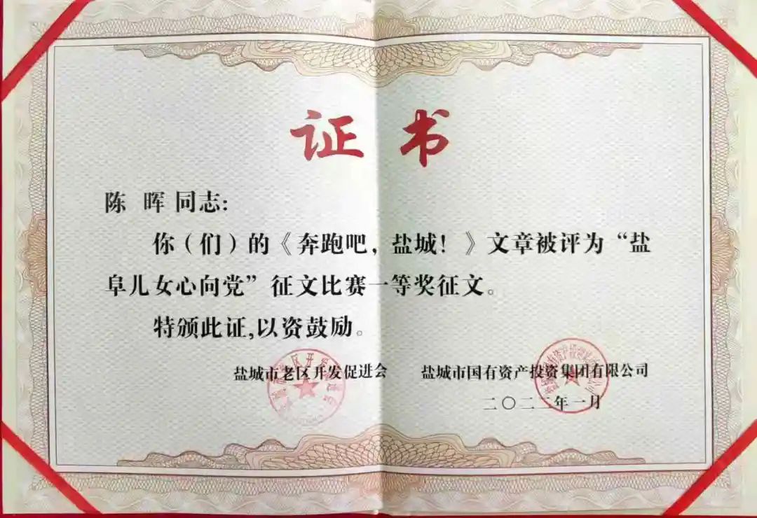1月19日,由鹽城市老區(qū)開發(fā)促進會、鹽城市國有資產(chǎn)投資投資集團有限公司主辦的“鹽阜兒女心向黨”征文評審表彰會議在鹽城隆重舉行,江蘇響水港港務(wù)有限公司財務(wù)部副經(jīng)理陳暉的《奔跑吧,鹽城!》作品在298篇文章中脫穎而出,榮獲一等獎。