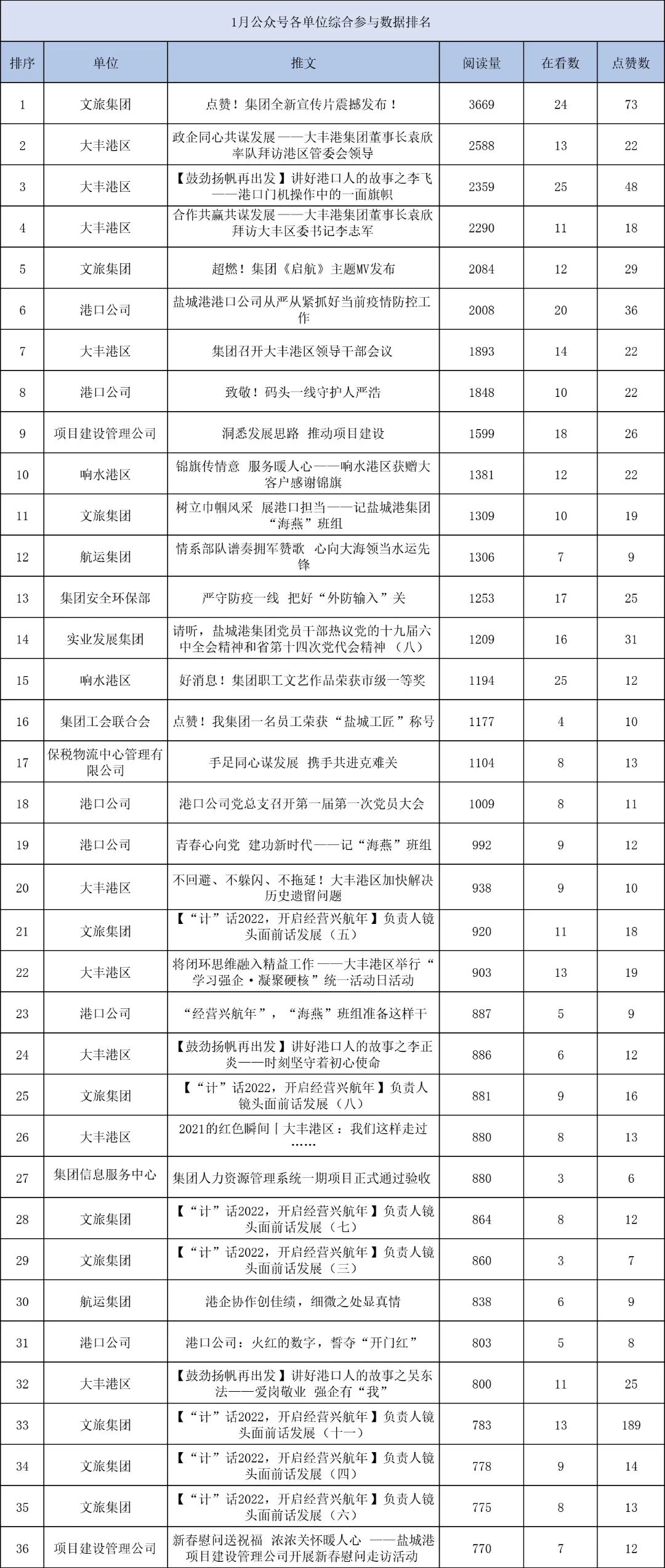 1月,“江蘇鹽城港控股集團”微信公眾號推送文章170篇,截至目前,閱讀總量14萬+,各單位供稿111篇。其中,文旅集團以2.1萬閱讀數,24篇稿件量,遙遙領先;大豐港區以1.8萬閱讀數,16篇稿件量,位列第二;港口公司、響水港區在供稿方面,以同樣13篇的數量并列第三,在閱讀量方面,港口公司以1.2萬的數量,位列單項第三;其他港口及板塊集團積極參與,踴躍投稿,情況較好。