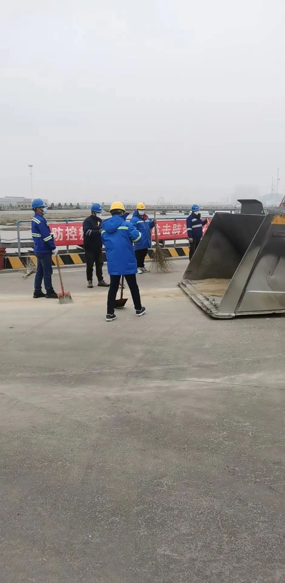 (生產部人員正在碼頭進行拋灑貨物清理)