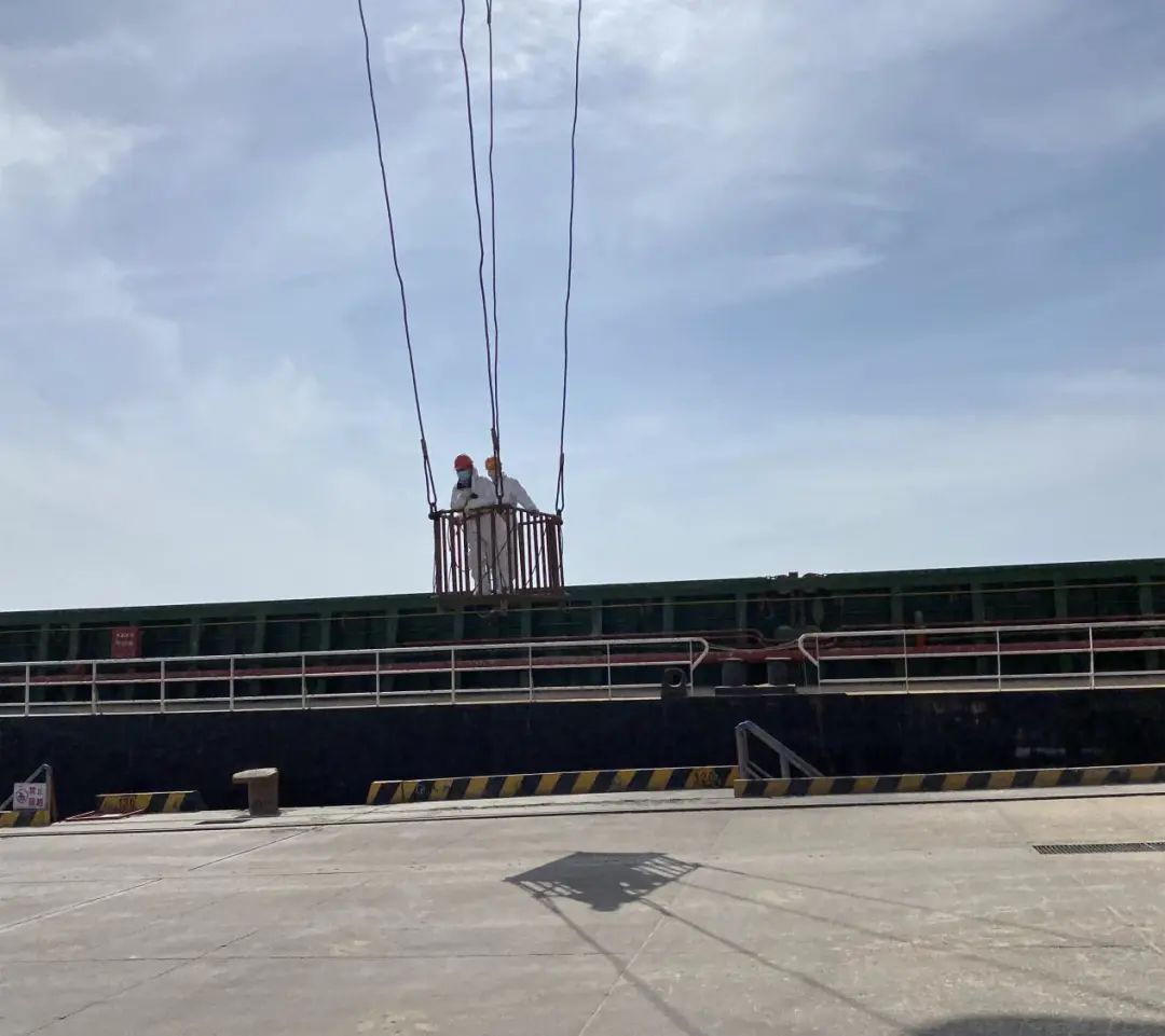 △清艙人員乘坐特殊“交通工具”下艙進(jìn)行清理工作