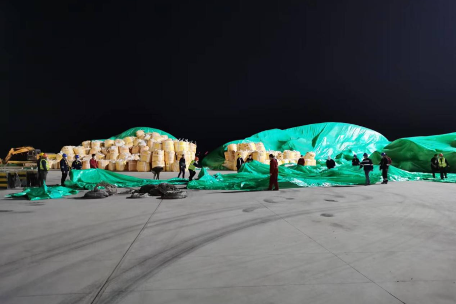 良好的服務(wù)是港口單位基業(yè)長青的基石所在,而良好的服務(wù),就是要始終堅持想客戶所想、急客戶所急,始終把客戶的利益放在心中。4月22日,載重3000噸袋裝化肥“鴻錦祥”輪順利移泊至響水港6#泊位,該船貨物由客戶自行負責裝卸。由于該輪貨物后期需直接轉(zhuǎn)運至另一艘大輪,考慮到作業(yè)成本,經(jīng)和我司協(xié)商后,客戶將相關(guān)貨物臨時堆放在了6#泊位碼頭面。4月26日下午16:00,“鴻錦祥”全船作業(yè)順利結(jié)束,而此時響水縣氣象局發(fā)布次日暴雨黃色預(yù)警,由于堆貨量較多,客戶自備的防雨布無法滿足碼頭現(xiàn)場貨物苫蓋,由于袋裝化肥相較于普通貨物,其貨品價值較高高,一旦雨淋受潮,貨物便會失去使用價值,給客戶造成無法挽回的損失。