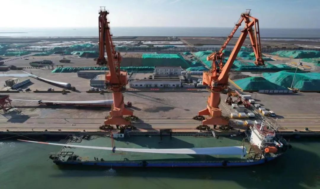 國電投山東海陽項目首套風電設備系濱海港建港以來進港海運最大的風力葉片,全長97米。此次運載的風力葉片從南通運至濱海港區碼頭,由于該葉片體身長,運輸過程中涉及安全系數較大,為確保萬無一失,從327省道轉入濱海港區后,生產經營條線安排專班人員實時跟蹤服務,及時協調清理影響拐彎的部分隔離護欄,保障途中各轉彎要道口的通行安全,順利抵達目的地——濱海港碼頭1號泊位。至此,三根風葉片全部被安全高效地裝載上貨輪,運往國電投山東海陽目的地。