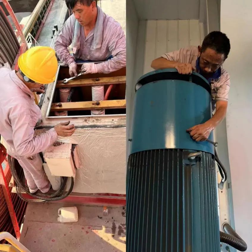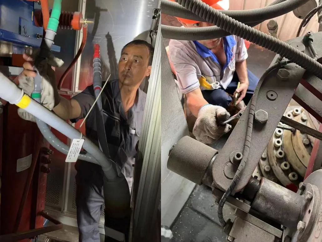天氣炎熱,設備也常“中暑”。“2#門機出現(xiàn)分波過熱故障,門機跳電了”,早上7點,剛到港的修理電工大宋就接到前方司機的報修指令。大宋隨即和同伴趕到現(xiàn)場,經(jīng)過排查,發(fā)現(xiàn)是左旋電機風機損壞。經(jīng)過2個多小時的搶修,設備再次順利投入使用。搶修人員剛下門機還沒來得及喝口涼水,對講機里又傳來了1#門機整機跳電故障報修。經(jīng)檢查判定這是一起因電纜滑環(huán)內(nèi)外溫差導致設備內(nèi)部有水凝造成的設備故障。此時戶外的溫度已達35℃,而門機機房經(jīng)過陽光的烘烤已近40℃,搶修人員卻毫不遲疑,立即投入搶修工作......