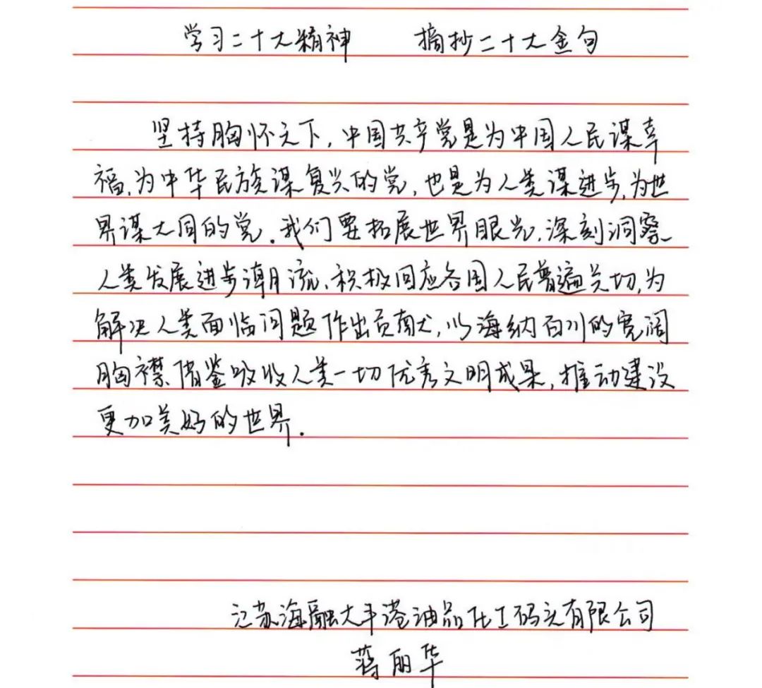 為深入學習宣傳貫徹黨的二十大精神,切實把思想和行動統一到黨的二十大精神上來,使黨員干部做到“學原文、悟原理、知原義”。近日,江蘇大豐港和順科技股份公司黨支部組織開展手抄黨的二十大報告“金句”活動,黨員干部積極參加、以筆抒懷,用特別的方式書寫對黨的赤誠忠心。