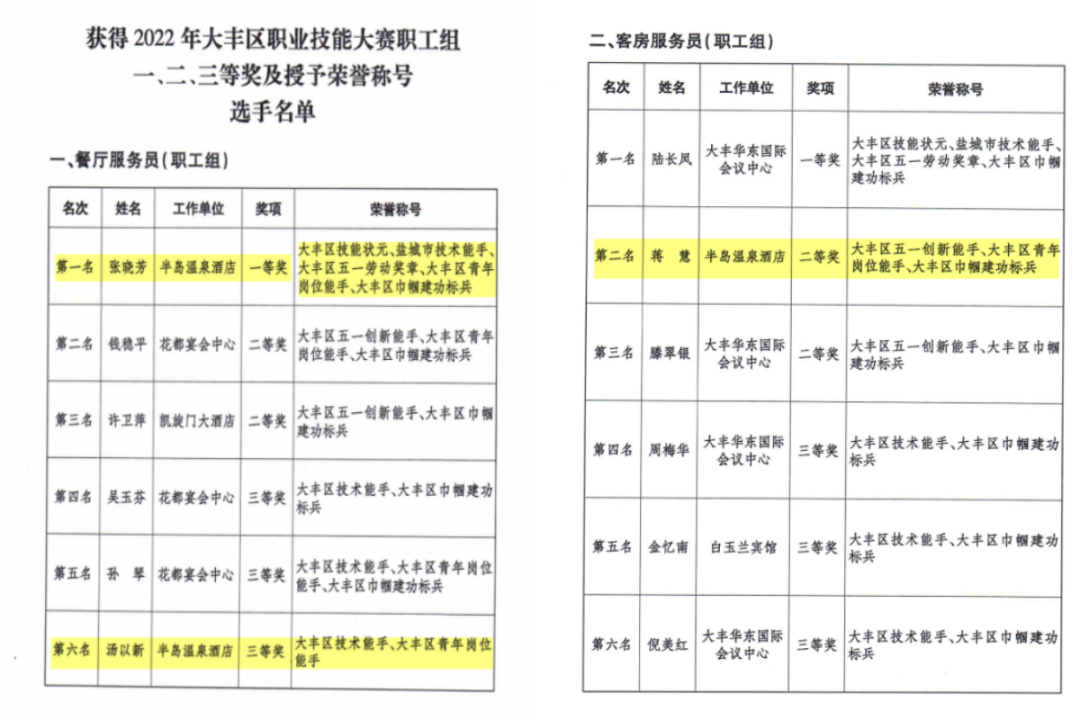 本次技能大賽結(jié)果由鹽城市大豐區(qū)人民政府、鹽城市人力資源和社會(huì)保障局聯(lián)合發(fā)布—《關(guān)于公布2022年大豐區(qū)職業(yè)技能大賽優(yōu)秀選手名單的通知》。港泊半島酒店參賽選手們?nèi)〉每上渤煽儯渲胁惋嫴繌垥苑纪疽詢?yōu)異的成績脫穎而出,勇奪餐飲服務(wù)競賽項(xiàng)目一等獎(jiǎng),并由鹽城市大豐區(qū)人民政府等5個(gè)部門分別授予“大豐區(qū)技能狀元”“鹽城市技術(shù)能手”“大豐區(qū)五一勞動(dòng)獎(jiǎng)?wù)隆钡葮s譽(yù)稱號;餐飲部湯以新同志榮獲“大豐區(qū)技術(shù)能手”“大豐區(qū)青年崗位能手”稱號;客房部蔣慧同志榮獲客房競賽項(xiàng)目組二等獎(jiǎng),并獲“大豐區(qū)五一創(chuàng)新能手”“大豐區(qū)青年崗位能手”“大豐區(qū)巾幗建功標(biāo)兵”榮譽(yù)稱號。