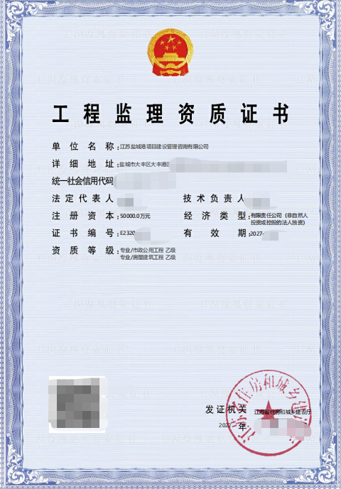 2022年11月18日,項(xiàng)目管理公司獲得由江蘇省住房和城鄉(xiāng)建設(shè)廳頒發(fā)的“房屋建筑工程乙級(jí)和市政公用工程乙級(jí)”兩項(xiàng)工程監(jiān)理資質(zhì)證書(shū),標(biāo)志著公司資質(zhì)申辦工作取得重大進(jìn)展,對(duì)提升公司品牌影響力,提高市場(chǎng)競(jìng)爭(zhēng)力具有重要的意義。