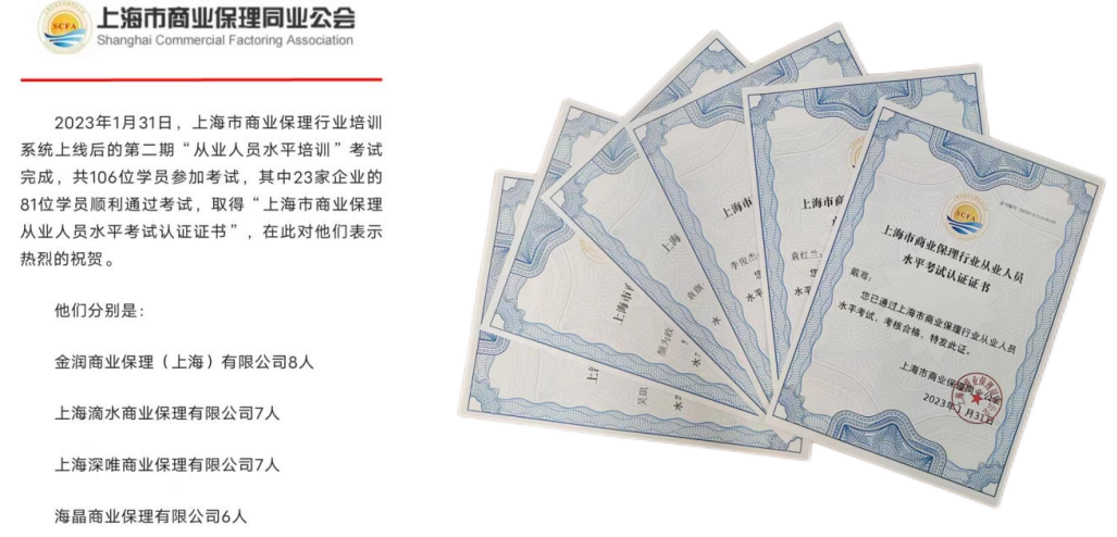 近日,海晶商業保理有限公司6名員工參加上海市商業保理水平培訓,順利通過考試并取得認證證書??荚囃ㄟ^人次在上海市商業保理行業名列前茅,充分展示了出色的專業水準。