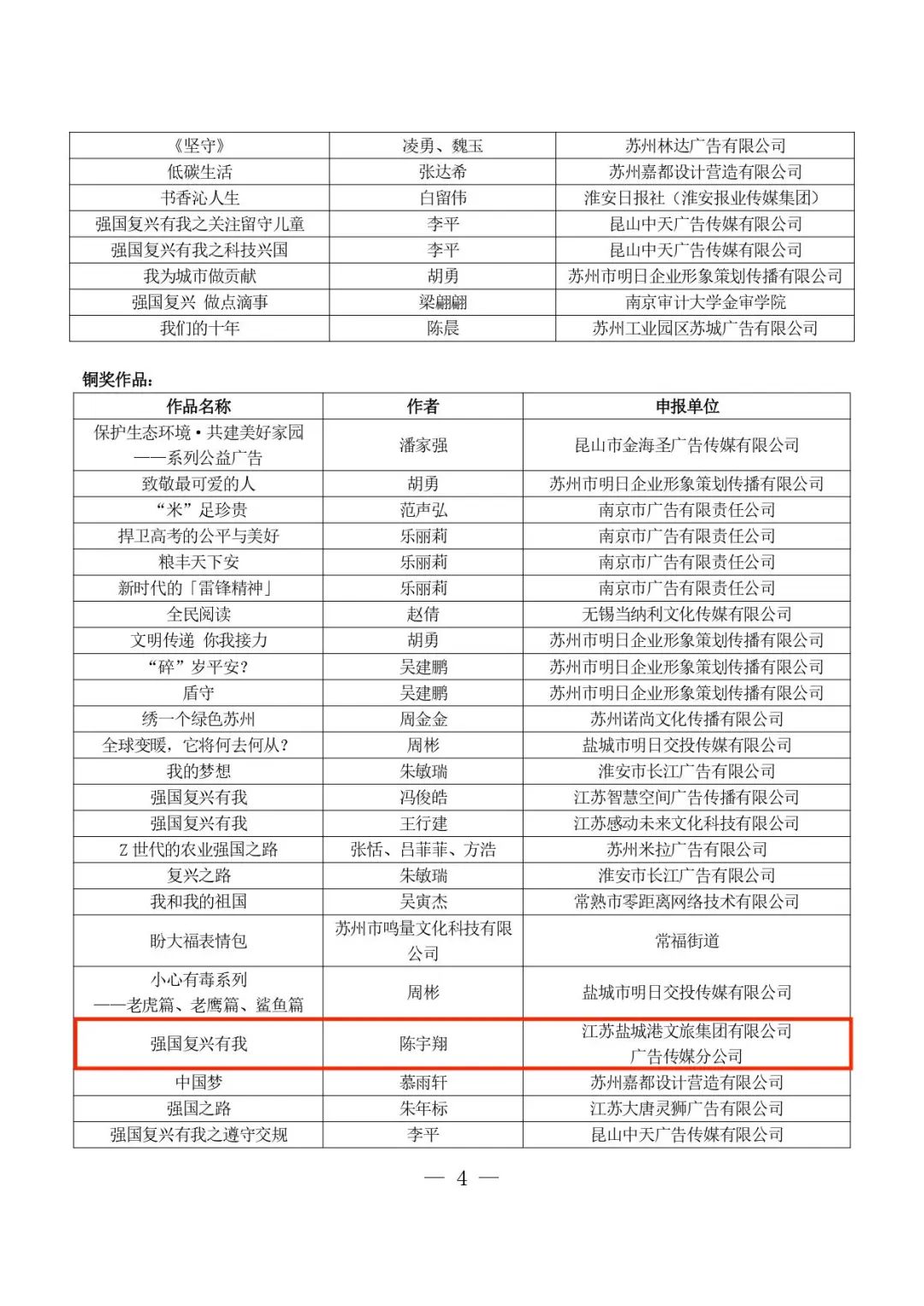據悉,“江蘇省優秀廣告作品大賽”由江蘇省廣告協會主辦,迄今為止已舉辦28屆,吸引了省內數百家公司參與,每屆賽事均有數千個作品參加比賽。本屆大賽,文旅集團廣告傳媒分公司憑借過硬的專業實力榮獲職業組公益類作品銅獎和職業組公益類作品優秀獎。