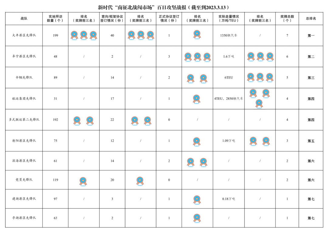 1.累計拜訪客戶數量1179家:其中大豐港區先鋒隊199家,多式聯運第二先鋒隊192家,黨員先鋒隊119家,響水港區先鋒隊99家,濱海港區先鋒隊97家,巾幗先鋒隊89家,射陽港區先鋒隊75家,亭湖港區先鋒隊63家,濱海港區先鋒隊61家,多式聯運第一先鋒隊55家,青年先鋒隊51家,阜寧港區先鋒隊48家,航運集團先鋒隊31家。