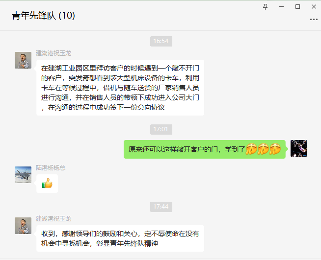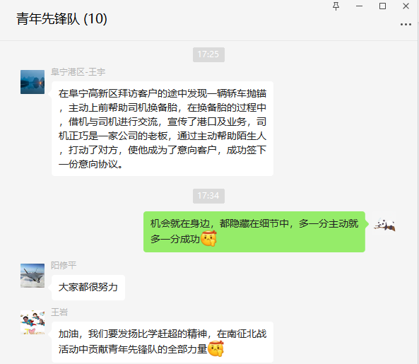 使命催人奮進,實干促人成長。青年先鋒隊特別注重隊員業(yè)務能力的持續(xù)提升。每周請一位隊員在青年先鋒隊群內分享拜訪心得,通過交流互動,不僅掌握了更高效的拜訪技巧,還加深了對港口需求趨勢的理解。