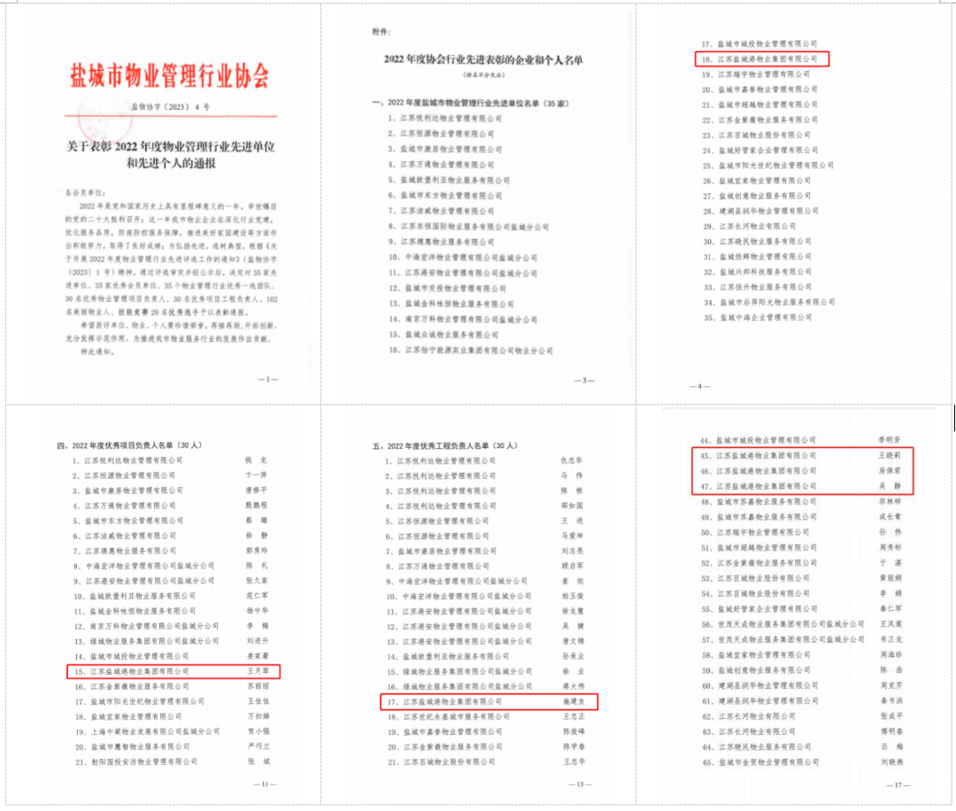 近日,鹽城市物業(yè)管理行業(yè)協(xié)會(huì)召開(kāi)第三屆第四次全體會(huì)員會(huì)議,對(duì)2022年度鹽城市優(yōu)秀物業(yè)企業(yè)和優(yōu)秀個(gè)人進(jìn)行表彰頒獎(jiǎng)。鹽城港物業(yè)公司再度獲評(píng)“市物業(yè)管理行業(yè)先進(jìn)單位”,王月琴、施建友、王曉莉、房俤君、吳靜等同志分獲“2022年度優(yōu)秀項(xiàng)目負(fù)責(zé)人”“2022年度優(yōu)秀工程負(fù)責(zé)人”“2022年度鹽城市物業(yè)管理行業(yè)美麗物業(yè)人”榮譽(yù)稱(chēng)號(hào)。