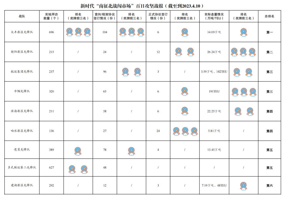 1.累計(jì)拜訪客戶數(shù)量3775家:其中大豐港區(qū)先鋒隊(duì)696家,多式聯(lián)運(yùn)第二先鋒隊(duì)627家,黨員先鋒隊(duì)389家,巾幗先鋒隊(duì)320家,建湖港區(qū)先鋒隊(duì)292家,多式聯(lián)運(yùn)第一先鋒隊(duì)263家,航運(yùn)集團(tuán)先鋒隊(duì)237家,射陽(yáng)港區(qū)先鋒隊(duì)215家,濱海港區(qū)先鋒隊(duì)211家,亭湖港區(qū)先鋒隊(duì)143家,響水港區(qū)先鋒隊(duì)136家,阜寧港區(qū)先鋒隊(duì)125家,青年先鋒隊(duì)121家。