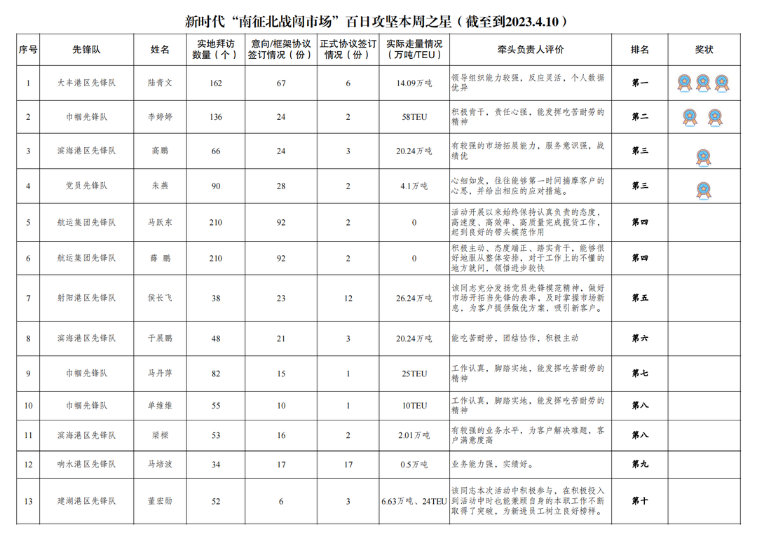 第一名:大豐港區(qū)先鋒隊(duì) 陸青文(拜訪客戶162家,簽訂意向協(xié)議67份,簽訂正式協(xié)議6份,實(shí)際走量14.09萬(wàn)噸)