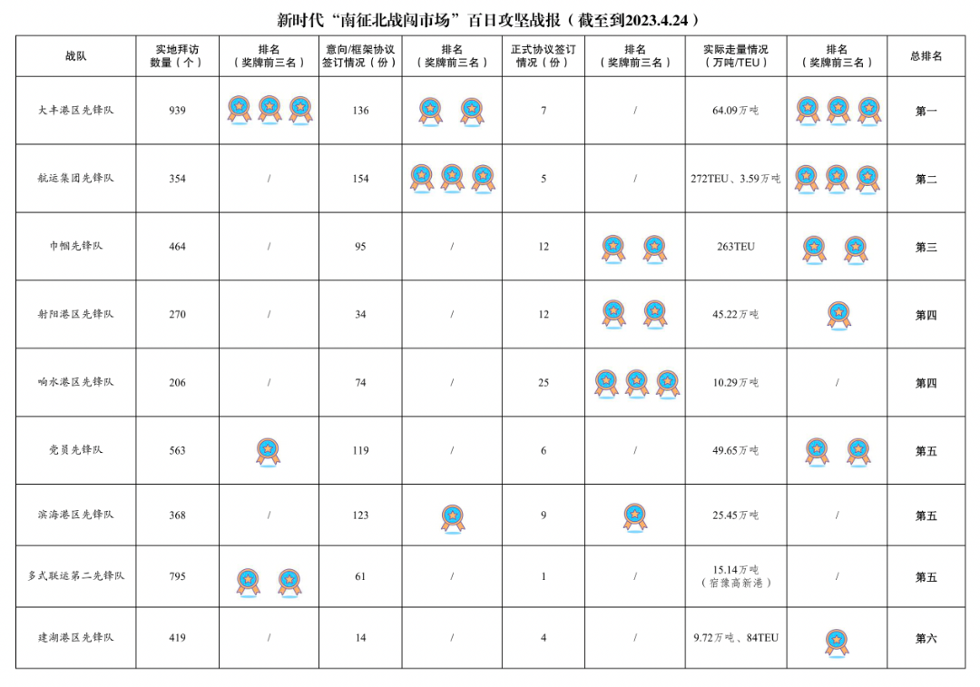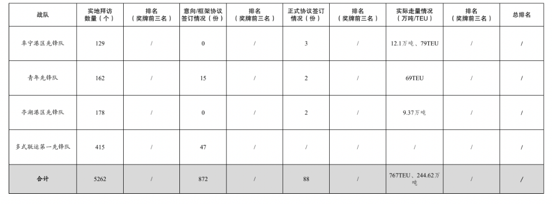 2.簽訂意向/框架協(xié)議數(shù)量872份:其中航運集團先鋒隊154份,大豐港區(qū)先鋒隊136份,濱海港區(qū)先鋒隊123份,黨員先鋒隊119份,巾幗先鋒隊95份,響水港區(qū)先鋒隊74份,多式聯(lián)運第二先鋒隊61份,多式聯(lián)運第一先鋒隊47份,射陽港區(qū)先鋒隊34份,青年先鋒隊15份,建湖港區(qū)先鋒隊14份。