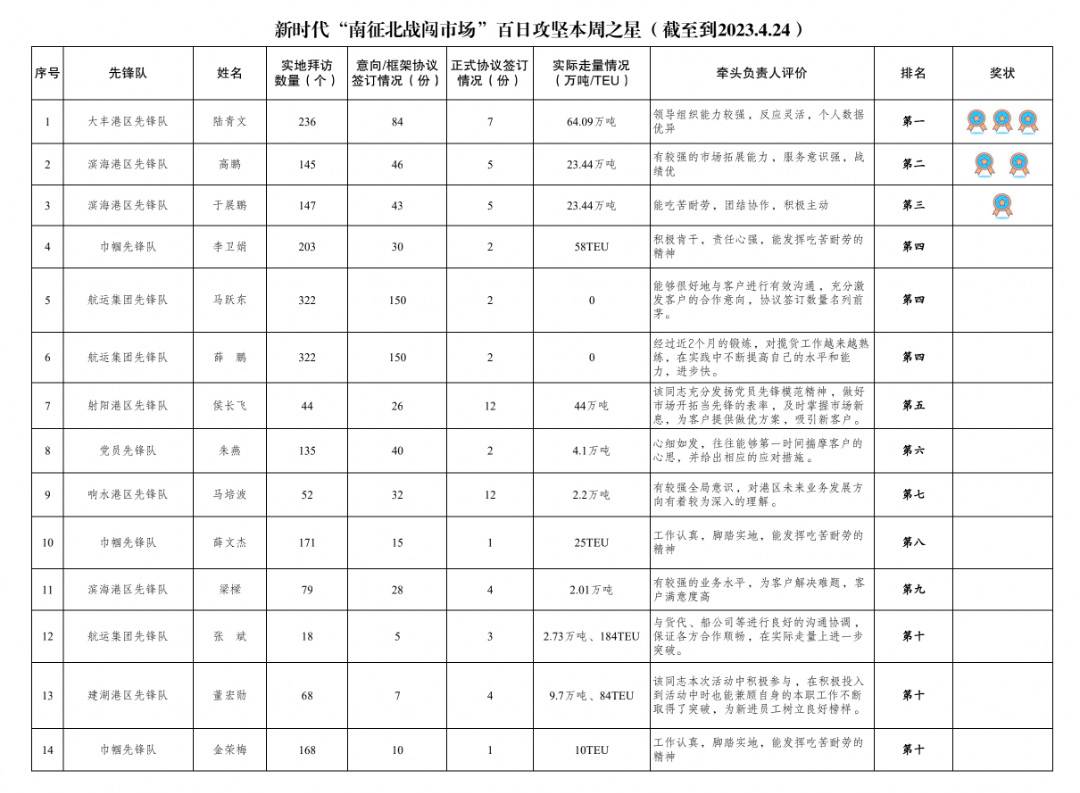 第一名:大豐港區(qū)先鋒隊 陸青文(拜訪客戶236家,簽訂意向協(xié)議84份,簽訂正式協(xié)議7份,實際走量64.09萬噸)