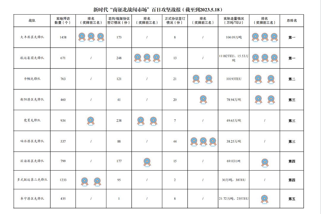 活動開展以來,累計(jì)拜訪客戶數(shù)量9907家,簽訂意向/框架協(xié)議數(shù)量1464份,簽訂正式協(xié)議173份,實(shí)際走量22000TEU、449.21萬噸。