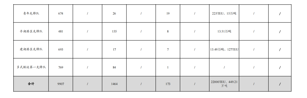 4.實(shí)際走量18601TEU、436.71萬噸:其中大豐港區(qū)先鋒隊(duì)104.09萬噸,航運(yùn)集團(tuán)先鋒隊(duì)11182TEU、15.53萬噸,射陽港區(qū)先鋒隊(duì)78.94萬噸,巾幗先鋒隊(duì)10193TEU,濱海港區(qū)先鋒隊(duì)69.03萬噸,阜寧港區(qū)先鋒隊(duì)21.72萬噸、235TEU,黨員先鋒隊(duì)49.65萬噸,青年先鋒隊(duì)225TEU、15萬噸,響水港區(qū)先鋒隊(duì)38.25萬噸,建湖港區(qū)先鋒隊(duì)13.49萬噸、127TEU,亭湖港區(qū)先鋒隊(duì)13.51萬噸,多式聯(lián)運(yùn)第二先鋒隊(duì)30萬噸,38TEU。