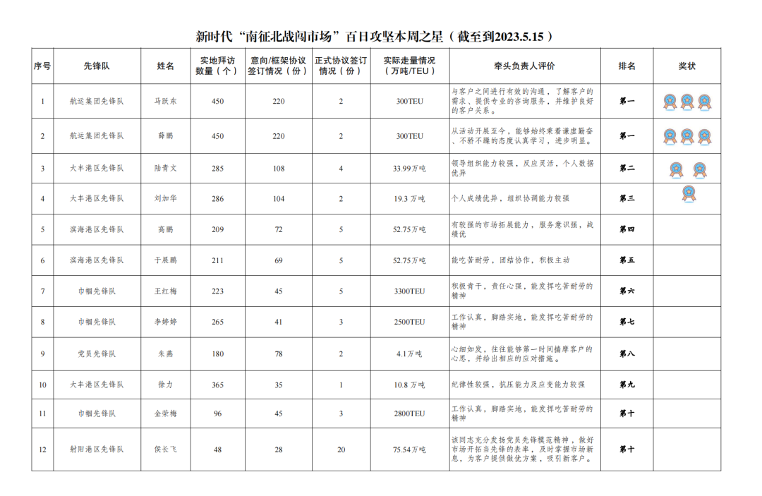 第一名:航運(yùn)集團(tuán)先鋒隊(duì) 馬躍東、薛鵬(拜訪客戶450家,簽訂意向協(xié)議220份,簽訂正式協(xié)議2份,實(shí)際走量300TEU)