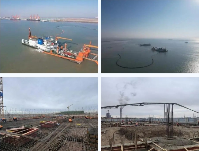 精雕細琢,匠心之作。項目條線人員爭分奪秒搶工期,推進項目“加速跑”,為保障船舶通航能力與通航安全,條線人員緊鑼密鼓推進5萬噸級航道港池維護疏浚工作,日前,絞吸式挖泥船“新海豚”號火力全開,每日疏浚量達6萬方,已完成工程總量的50%,預計春節前將全部完工。倉儲物流項目現場氣勢寬宏,各施工業面井然有序、一片繁忙。目前,生產樓已完成一、二層框架結構,正在進行展廳結構鋼筋綁扎和四層疊合板安裝,預計春節前能夠完成生產樓主體結構封頂。