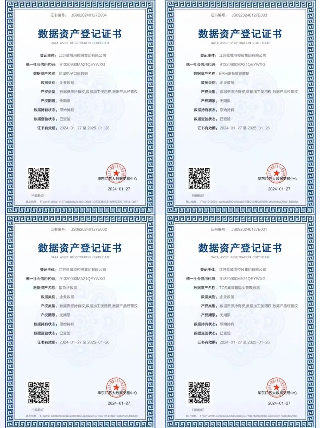 日前,鹽城港集團順利完成集裝箱碼頭生產(chǎn)操作系統(tǒng)(TOS)、電子口岸系統(tǒng)、港機設備物資管理系統(tǒng)(EAM)、散雜貨生產(chǎn)管理系統(tǒng)(MES)數(shù)據(jù)資產(chǎn)質(zhì)量評價及價值評估,并獲得《數(shù)據(jù)資產(chǎn)登記證書》,成為鹽城市首批完成數(shù)據(jù)資產(chǎn)登記的企業(yè)之一,也是全國首個港口企業(yè)數(shù)據(jù)資源入表案例。