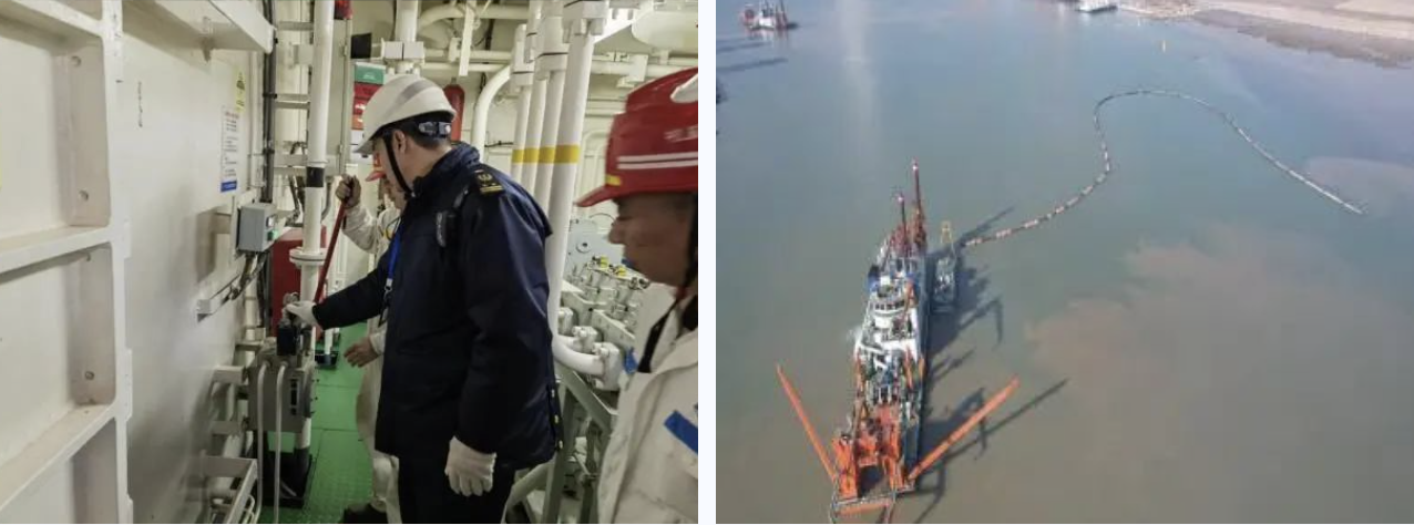 受季節性回淤影響,當前港池內水深難以保障大型船舶進出港口通航。聞此訊息,濱海港區及時制定詳細施工方案和安全生產防范要點,組織拼接浮管并協調絞吸船“新海豚”從梅山調遣至濱海港海域場地,面對工期緊、現場船舶密度大、寒潮大風等惡劣天氣的影響,他們搶節點,抓進度,分秒必爭完成倒樁、封艙、船檢、解封、項目交底、海事安檢等工作,高質量推進主港池清淤工程快速、穩健的完成。
