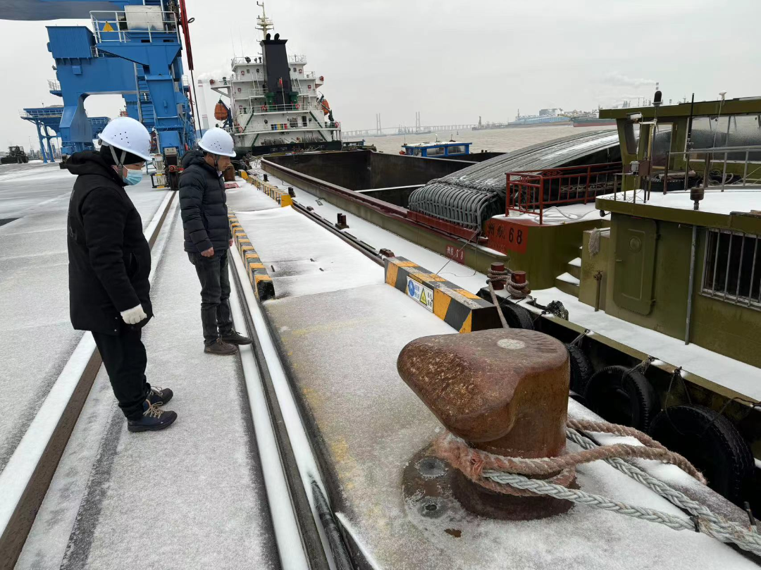 響水港區(qū)啟動(dòng)氣象災(zāi)害 (道路結(jié)冰、寒潮、暴雪)應(yīng)急響應(yīng),對(duì)靠泊碼頭的船舶、設(shè)備防風(fēng)工作作出周密部署和安排。對(duì)機(jī)械設(shè)備防風(fēng)裝置及風(fēng)速儀等設(shè)施進(jìn)行逐一排查,切實(shí)做好大型設(shè)備標(biāo)準(zhǔn)防風(fēng)工作;對(duì)靠港船舶檢查防滑網(wǎng)、扶手繩等,并要求全部船舶按照規(guī)范要求系泊纜繩;對(duì)變電所、箱變、輸電線路等設(shè)施進(jìn)行了統(tǒng)一檢查,排除用電安全隱患,全方位保障生產(chǎn)安全穩(wěn)定。