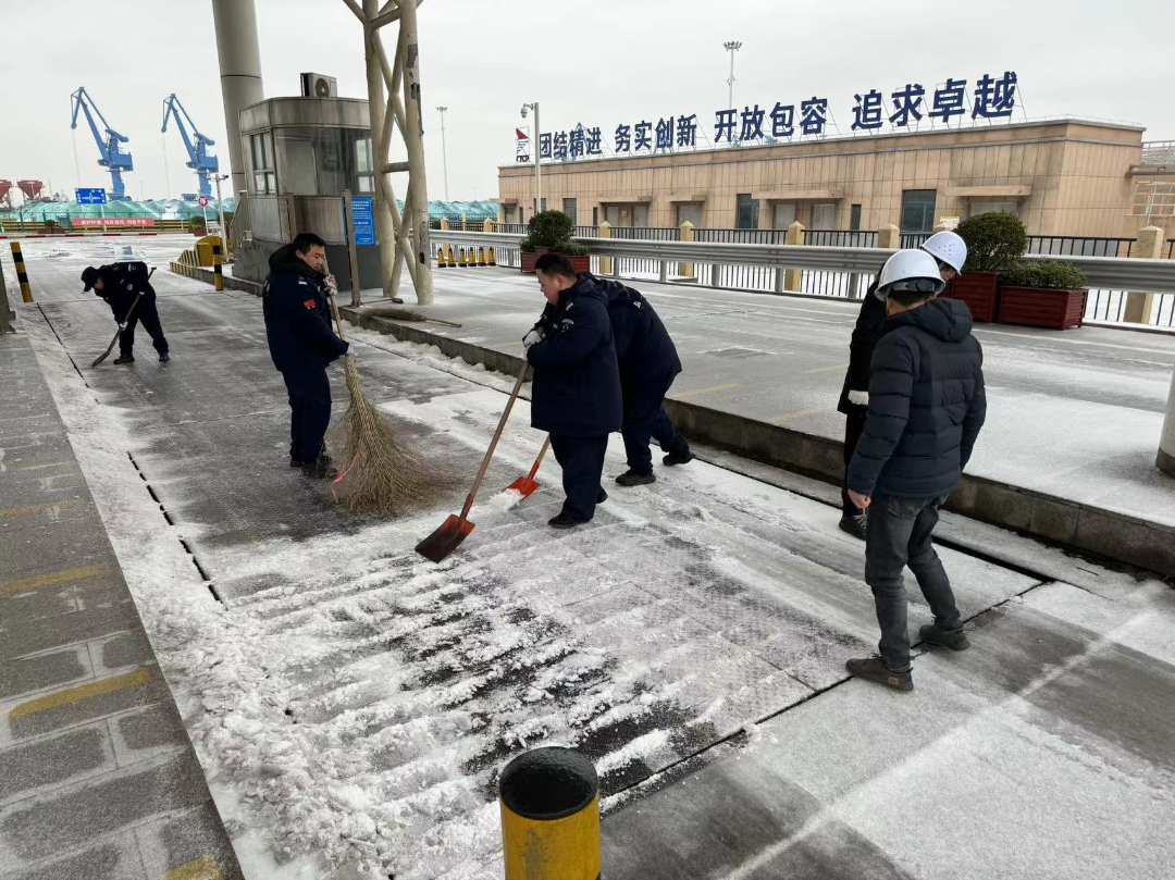 為排除現(xiàn)場(chǎng)積雪,防止道路結(jié)冰帶來(lái)的安全隱患,響水港區(qū)采取“機(jī)械+人工”協(xié)同作業(yè)模式,對(duì)港區(qū)重點(diǎn)區(qū)域、主要道路和交通要道等進(jìn)行清掃,同時(shí)根據(jù)道路積雪情況,適時(shí)組織拋撒融雪劑,全力以赴保障港區(qū)道路暢通及職工出行安全。